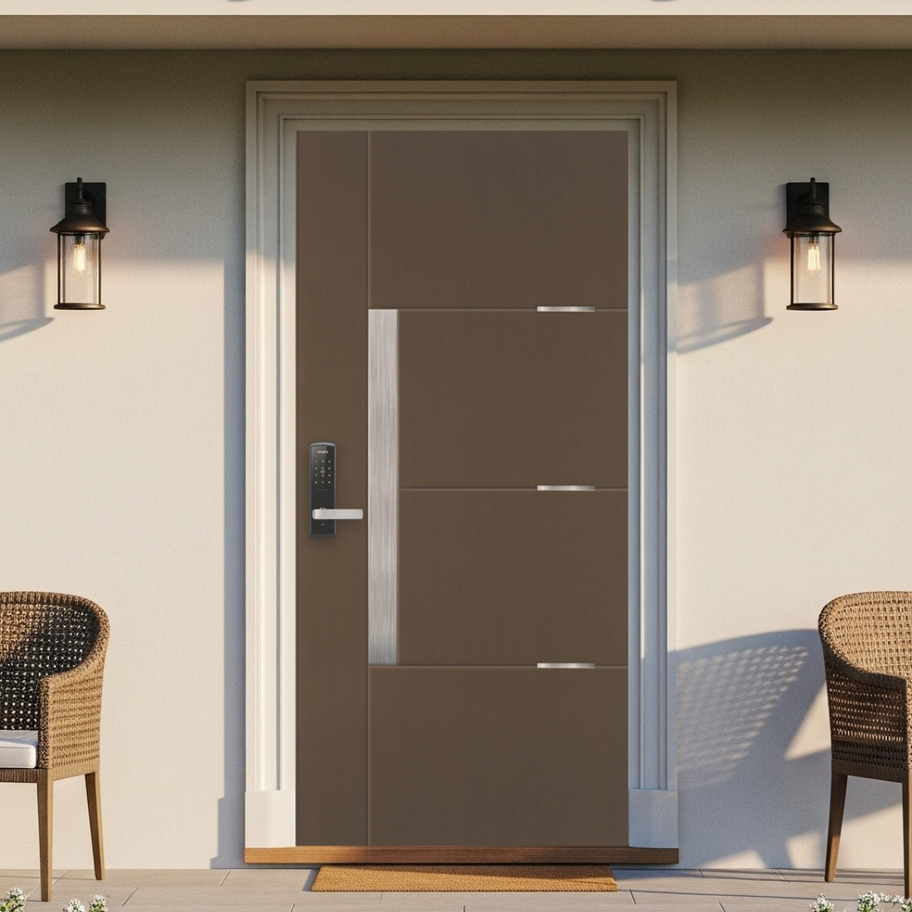 Permukaan pintu datar dan mulus dengan ditambah list stainless steel serta steel plate di perumukaan menciptakan tampilan modern dan elegan